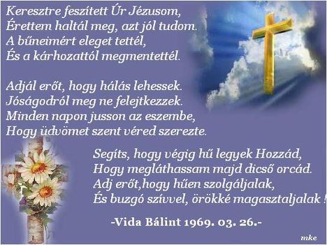 Imádság: Segíts Urunk, hogy benned megtaláljuk az erőt, amivel legyőzzük fájdalmunkat; és felfedezzük a reménységet, amiben soha nem csalódunk. Ámen.